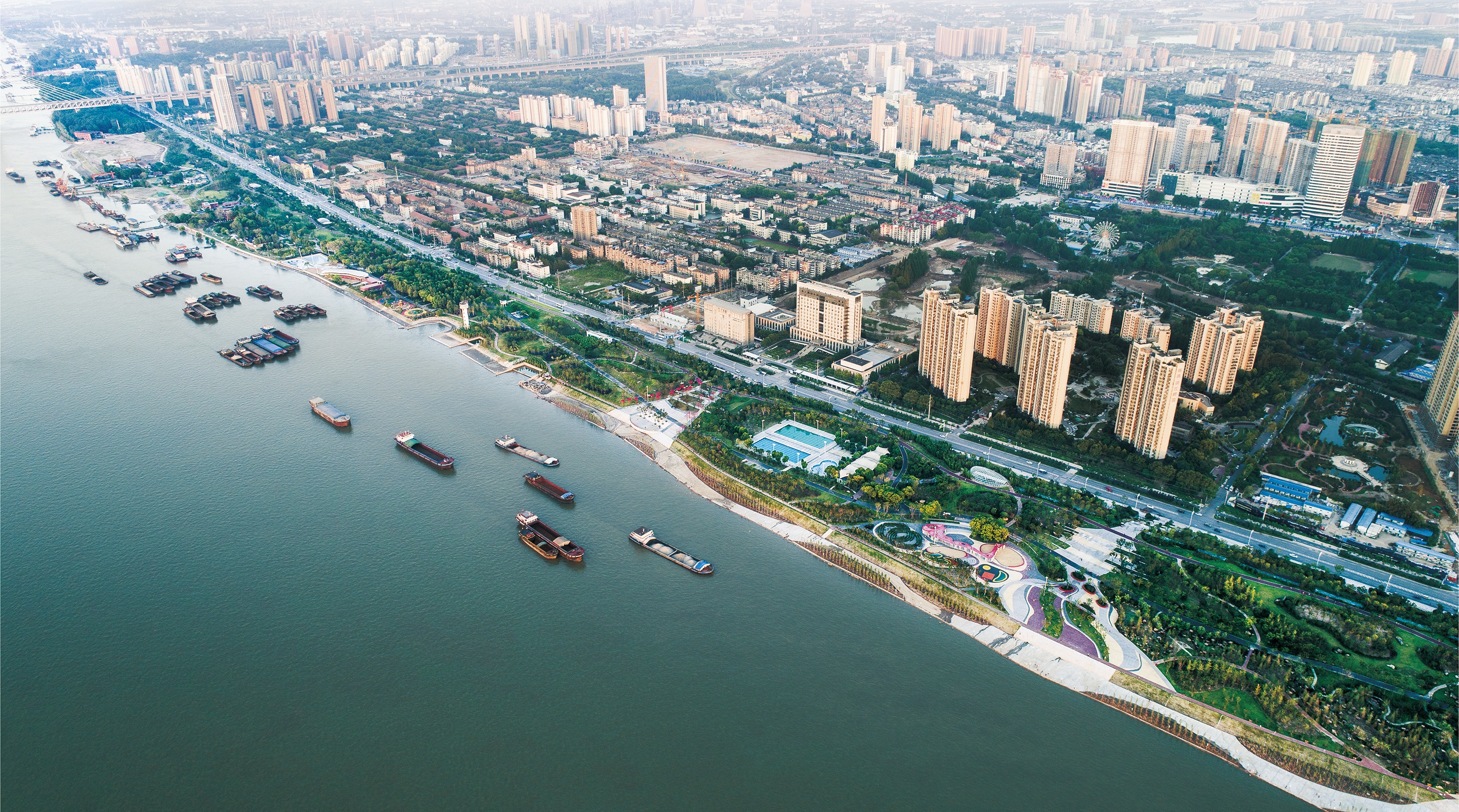 由中國一冶承建的武青堤工程是全國首批海綿城市試點項目之一,是湖北省首個“海綿”江灘和綠化比例最高的江灘,全長7.5公里,總面積135.48萬平方米。中國一冶研發(fā)應用“人水和諧多功能城市生態(tài)堤岸建造關鍵技術”,首次在長江一級干堤采用“似堤非堤”的微地形手法,打造“城市、江灘、堤防三位一體”的生態(tài)江灘。